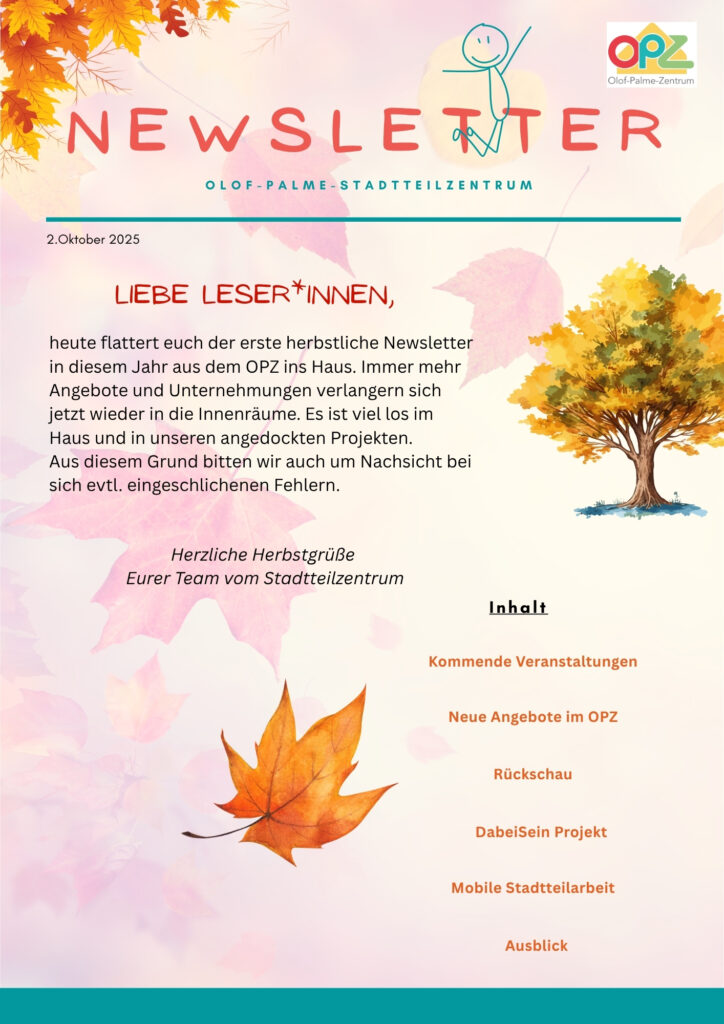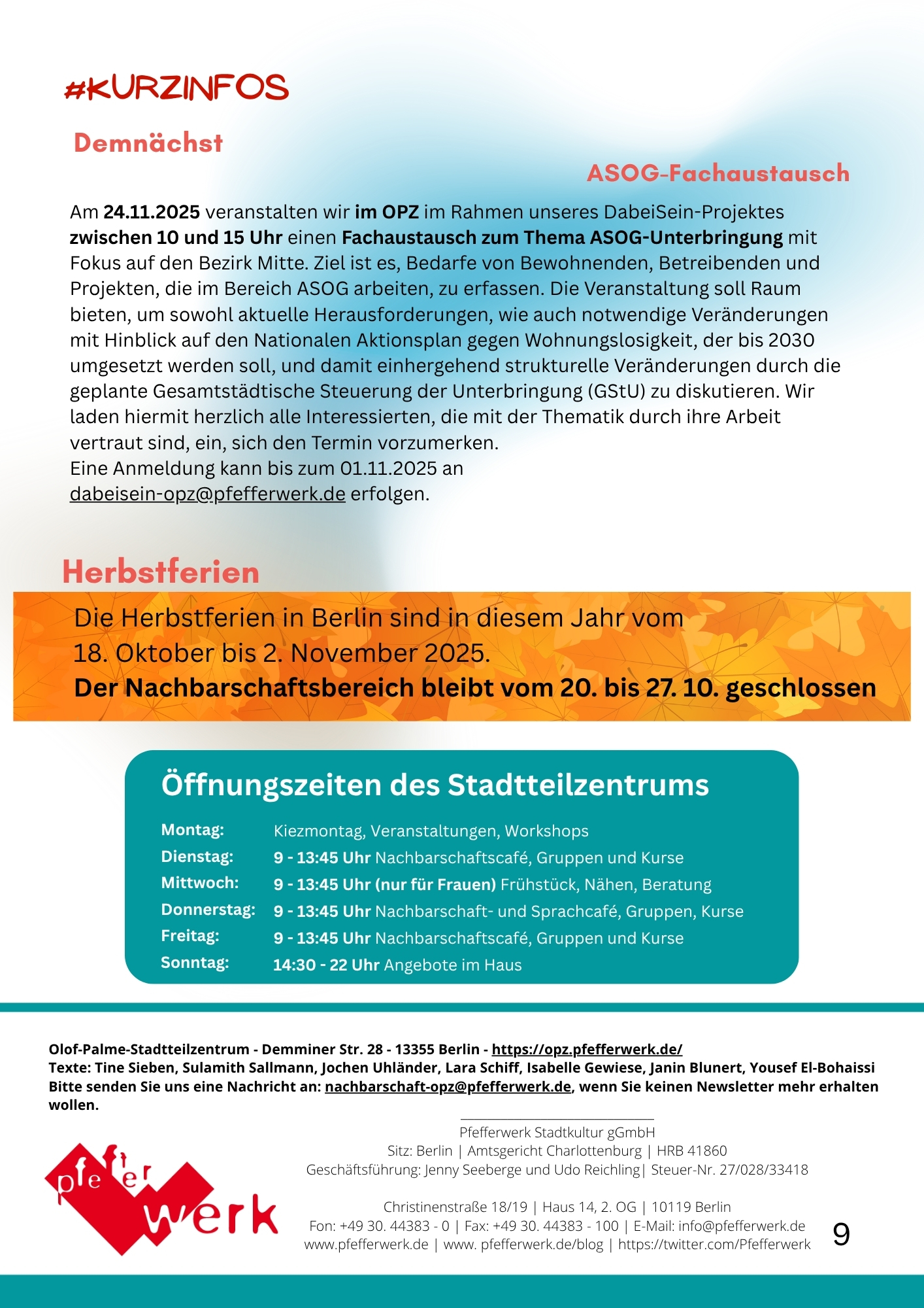 Wenn Sie regelmäßig unsere aktuellen Newsletter zugeschickt bekommen möchten, schreiben Sie uns bitte eine E-Mail an nachbarschaft-opz@pfefferwerk.de